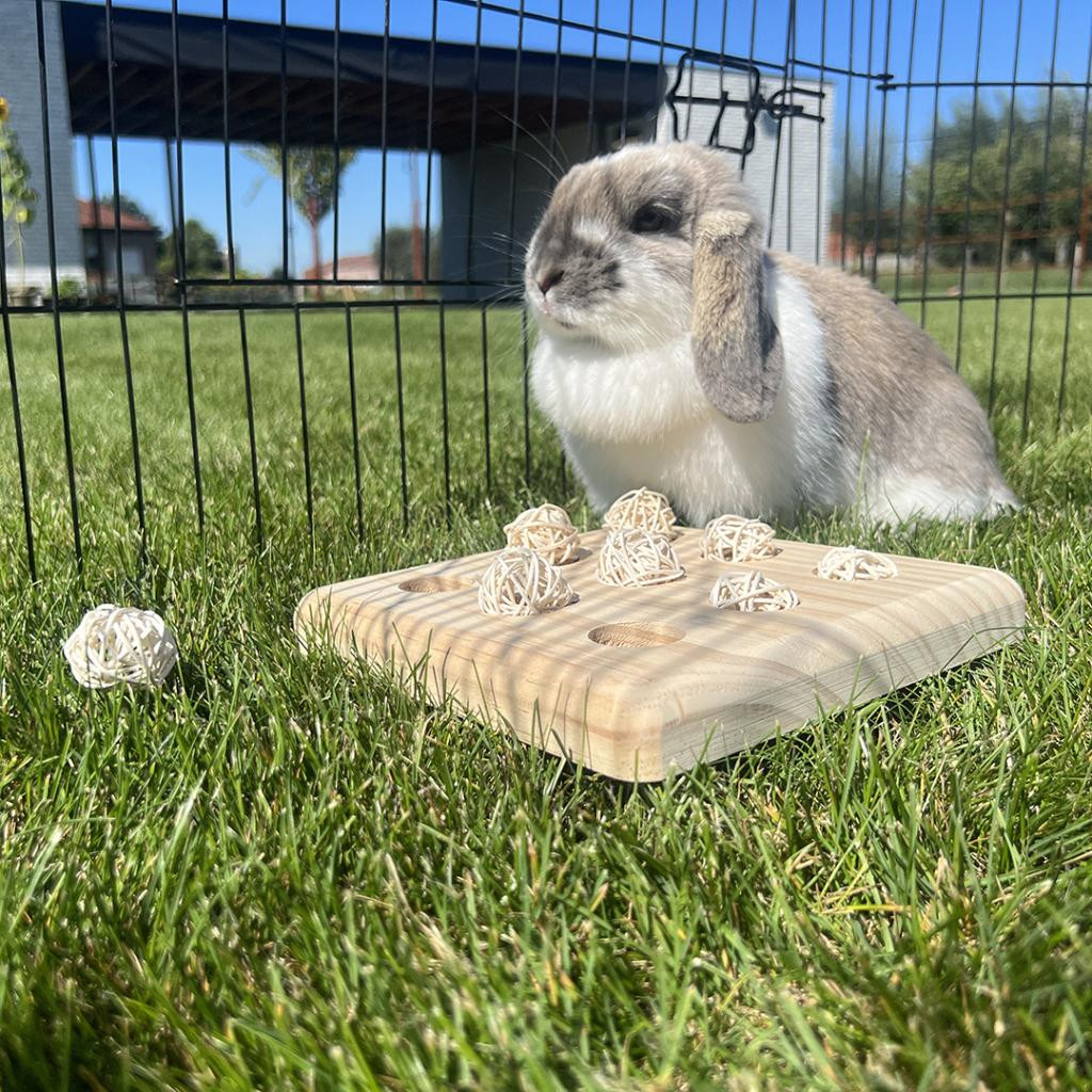 Tartsd nyuszidat vagy kisállatodat boldogan és szórakoztatva ezzel a duvoplus fenyőfából és fűzfagolyókból készült játék- és jutalomfalat-kirakóval. Helyezz ízletes jutalomfalatokat vagy ételt a kirakó nyílásaiba. Ez a jutalom arra ösztönzi kedvencedet, hogy többet mozogjon és játsszon. A fajátékok a természetes rágási ösztönt is elősegítik, és egészségesen tartják a fogakat.