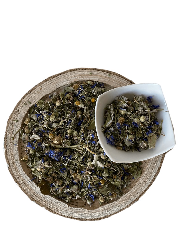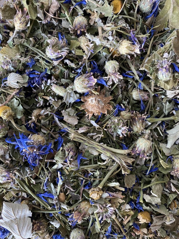 Petrezselyemszár, búzavirág, málnalevél, szederlevél, kasvirág, kamilla