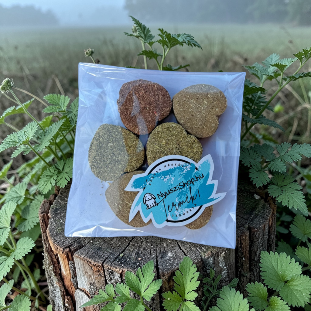 Készülj fel a rágcsálás örömére! Ezek a Mini szívek szénából egy 6 darabos, imádnivaló csomagban érkeznek, melyek garantáltan elvarázsolják kis fülesedet. Képzeld el, ahogy bundás barátod boldogan morzsolgatja ezeket a tiszta szénából, édes sárgarépából és zamatos eperből készült finomságokat! Nemcsak szuper ízletesek, de 100%-ban gabonamentesek, és teljes mértékben mentesek mesterséges színezékektől és tartósítószerektől – pont úgy, ahogy azt a Nyuszishop.hu-tól megszoktad. Tökéletes, egészséges jutalomfalat nyusziknak, tengerimalacoknak, deguknak, chinchilláknak és minden más növényevő kisemlősnek, akik egy kis szeretetre vágynak!